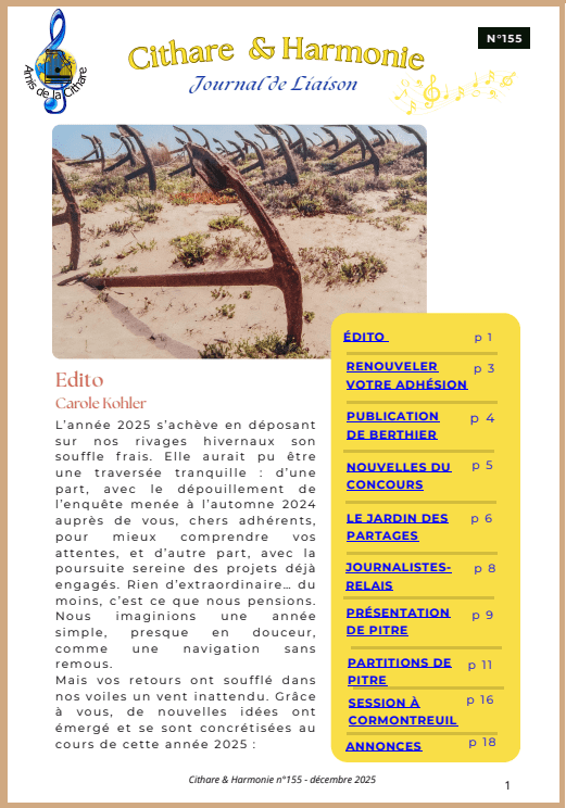 Et bientôt, en 2026 — si la marée nous est favorable — paraîtront les méditations de Jean Hurter, qui viendront enrichir encore notre répertoire pour cithare et offrir de nouvelles pages à explorer. Sans oublier la poursuite de la valorisation de nombreux textes grâce à la bibliothèque en ligne, qui continue de s’étoffer au service de nos adhérents.