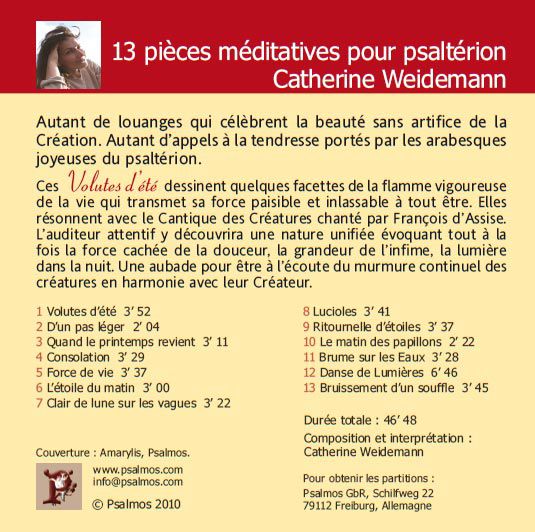 CD du recueil de partition de Catherine Weidemann.13 pièces méditatives pour psaltérion solo. Des louanges et des appels à la tendresse portés par les arabesques joyeuses du psaltérion