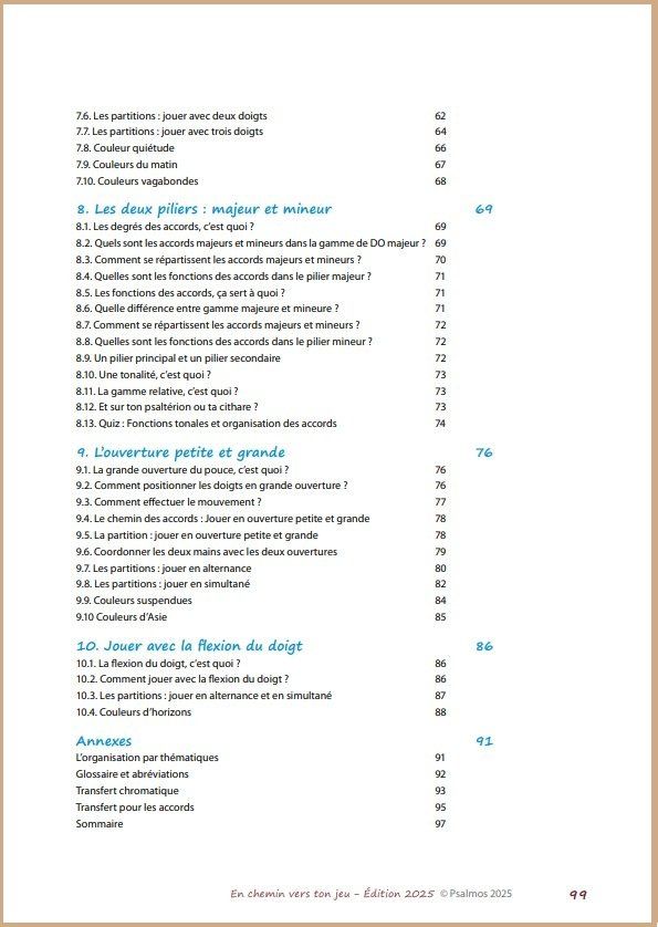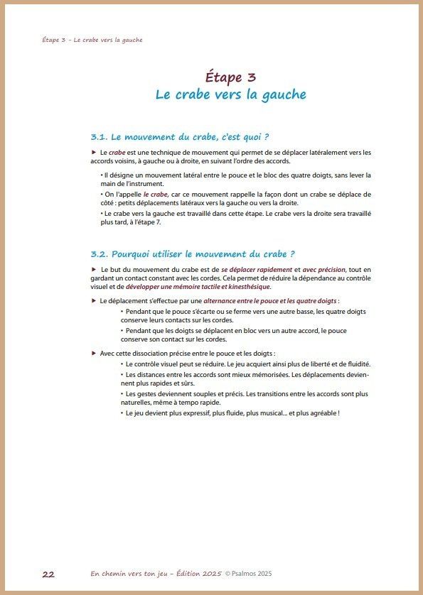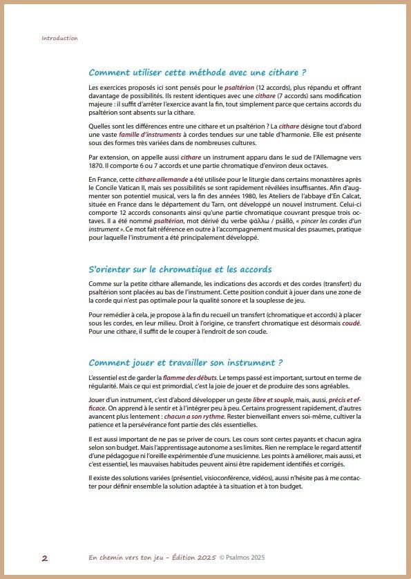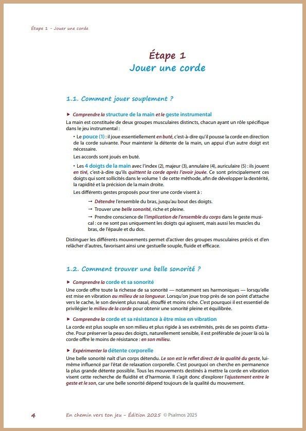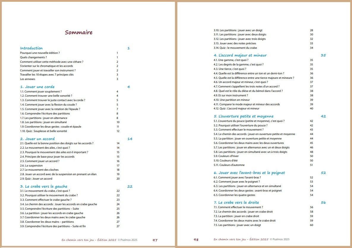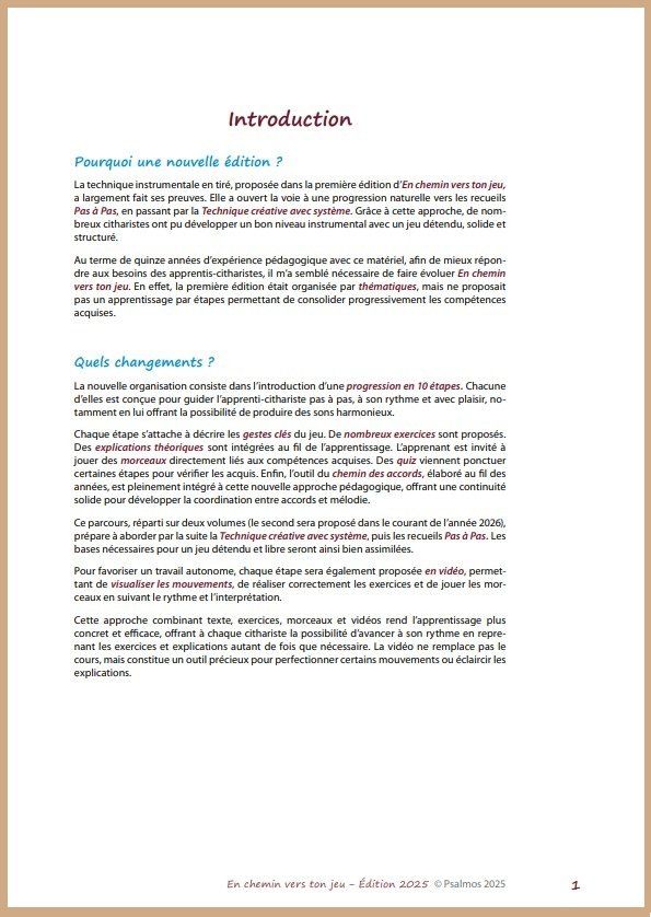 Au terme de quinze années d’expérience pédagogique avec ce matériel, afin de mieux répondre aux besoins des apprentis-citharistes, il m’a semblé nécessaire de faire évoluer En chemin vers ton jeu. En effet, la première édition était organisée par thématiques, mais ne proposait pas un apprentissage par étapes permettant de consolider progressivement les compétences acquises.