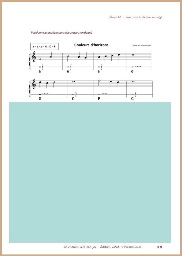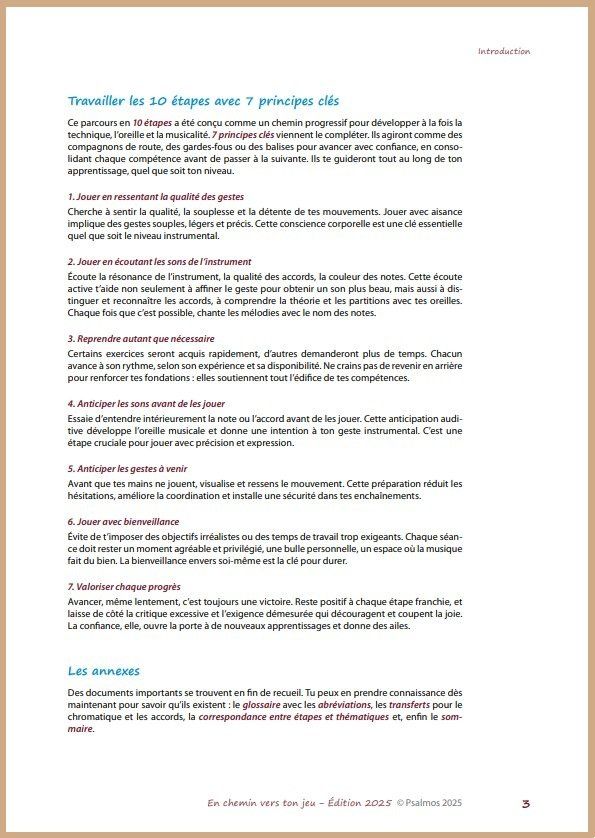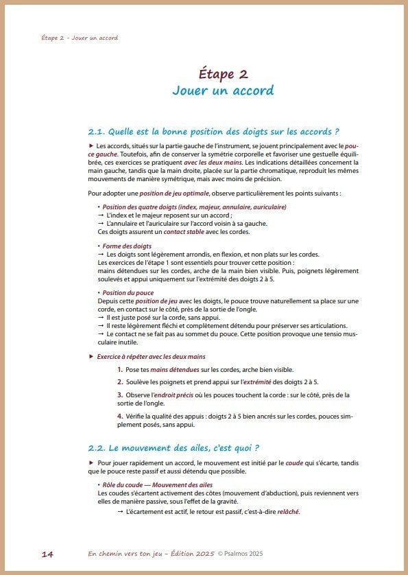 Ce parcours, réparti sur deux volumes (le second sera proposé dans le courant de l’année 2026), prépare à aborder par la suite la Technique créative avec système, puis les recueils Pas à Pas. Les bases nécessaires pour un jeu détendu et libre seront ainsi bien assimilées.
